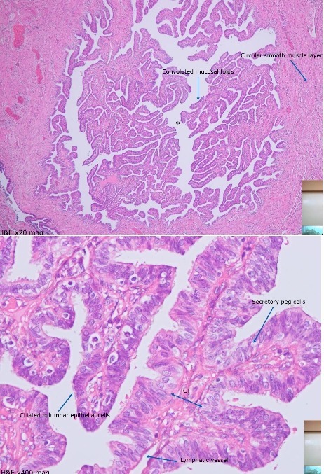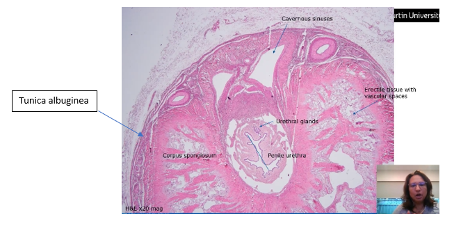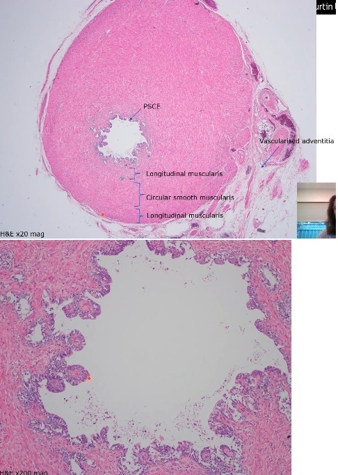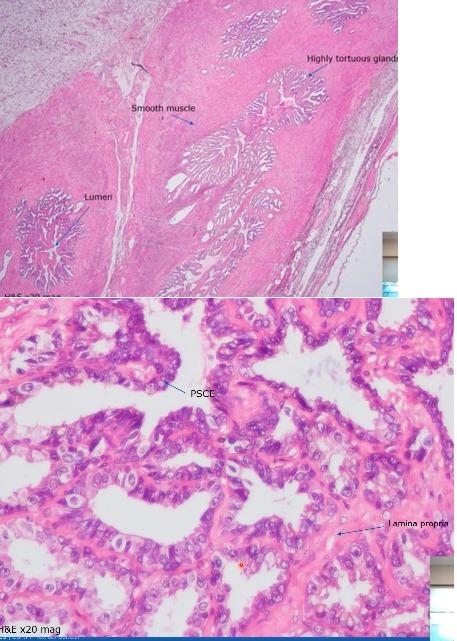 Tortuous glands Lined by pseudostratified columnar epithelium Thick CT capsule (tunica albuginea) Lamina propria made up of elastic fibres LP surrounded by smooth muscle