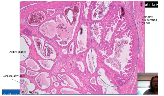 Corpora amylacia present (hyaline within glands)