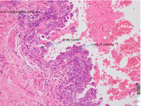 Loss of normal urothelium Cells have irregular nuclei and nucleoli Ulceration of epithelial layer Lamina propria with inflammatory cells Epithelial cells exfoliating into lumen No invasion into submucosa (basement membrane still intact)
