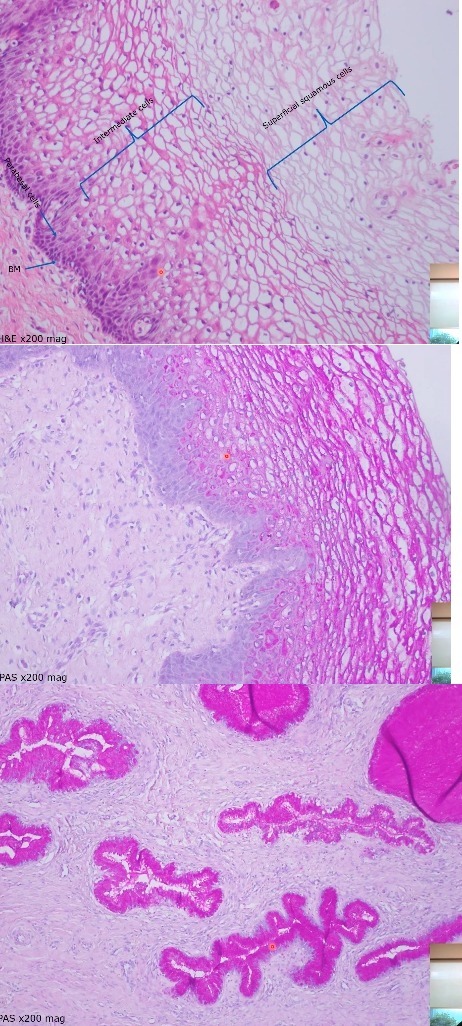 Endocervical glands also stain positive on PAS (cystic lakes may also be seen staining positive)