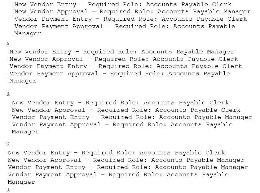 An organization's internal auditor discovers that large sums of money have recently been paid to a vendor that management does not recognize. The IT security department is asked to investigate the organizations the organization's ERP system to determine how the accounts payable module has been used to make these vendor payments. The IT security department finds the following security configuration for the accounts payable module: ✑ New Vendor Entry "" Required Role: Accounts Payable Clerk ✑ New Vendor Approval "" Required Role: Accounts Payable Clerk ✑ Vendor Payment Entry "" Required Role: Accounts Payable Clerk ✑ Vendor Payment Approval "" Required Role: Accounts Payable Manager Which of the following changes to the security configuration of the accounts payable module would BEST mitigate the risk?