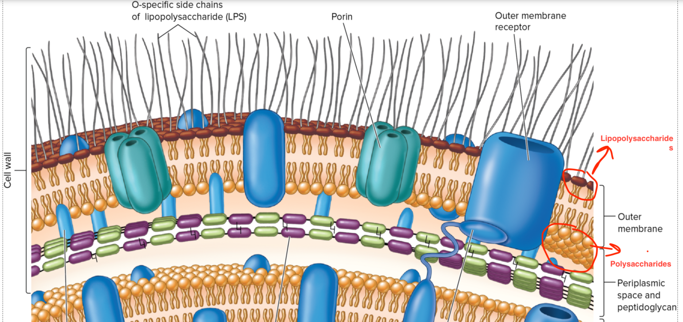 the external layer (facing the environment) is comprised of LIPOPOLYSACCHARIDES. while the inner layer (facing the cell) contains phospholipids
