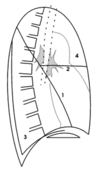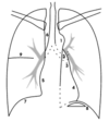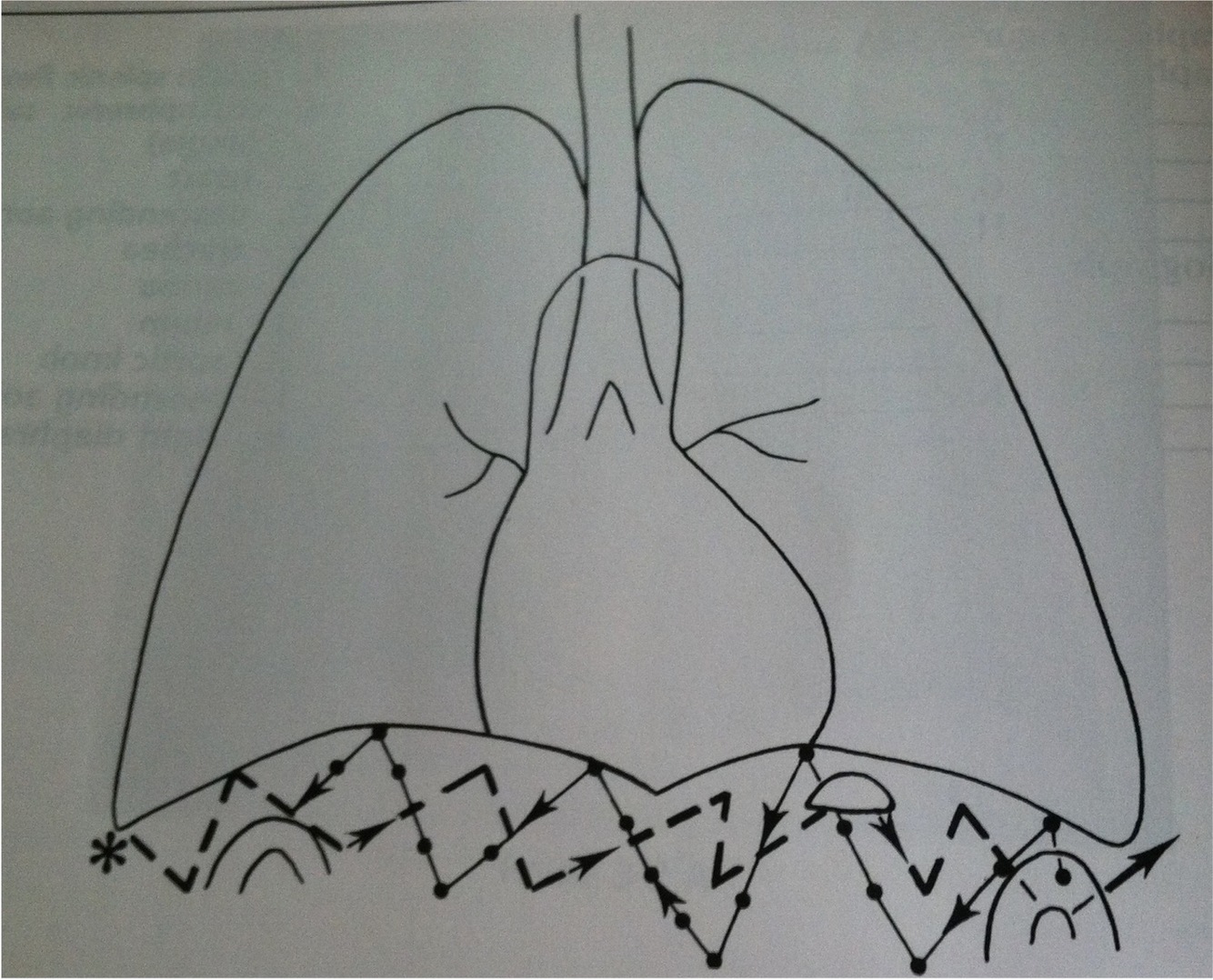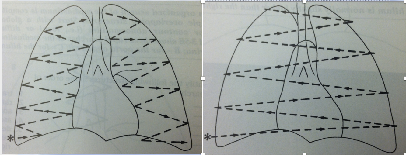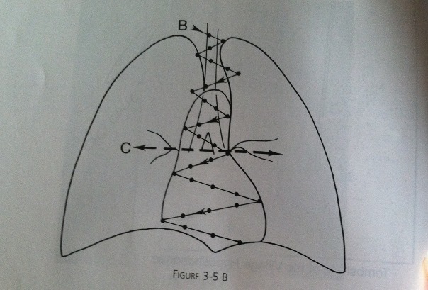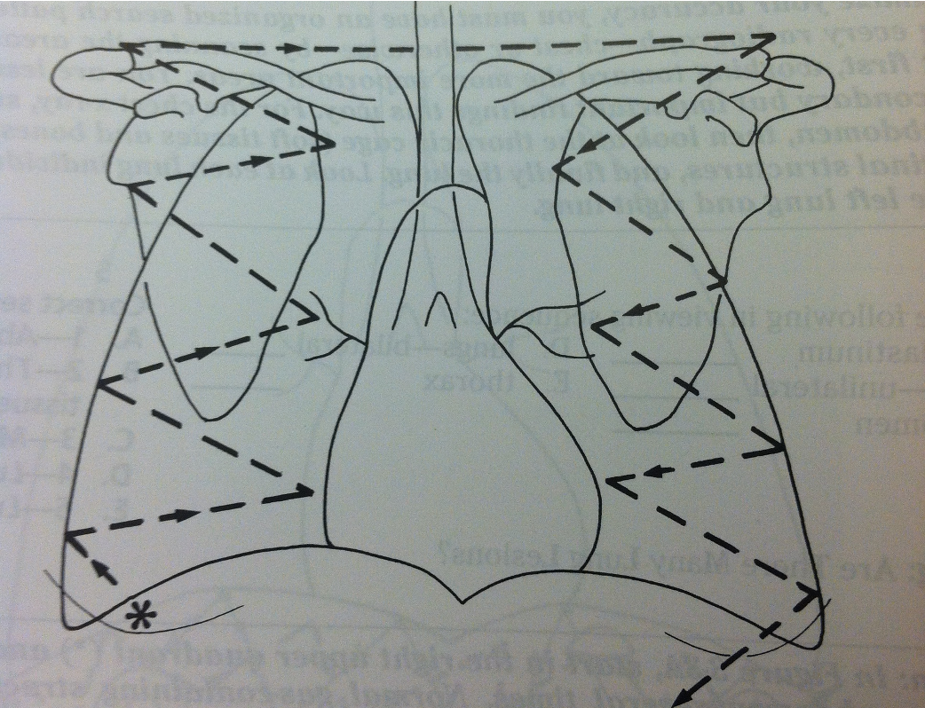 The pattern of how you will scan the mediastinum and heart of a CXR.