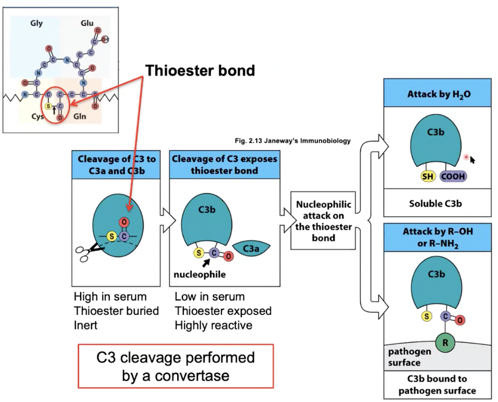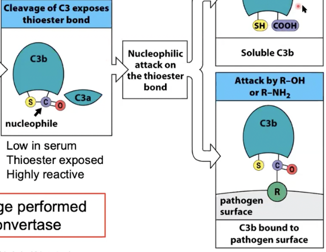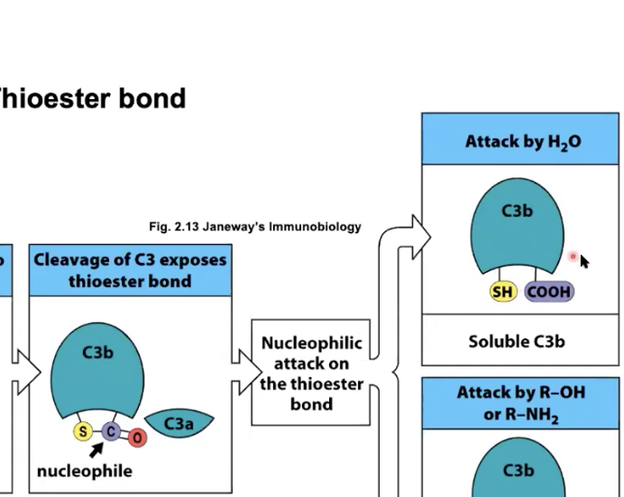 what happens to C3b thioester bond when attacked by ROH or RNH2?