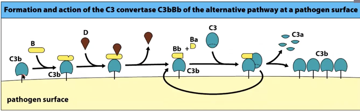 •Amplification loop – each newly bound C3b can make another convertase by binding to its own B and D