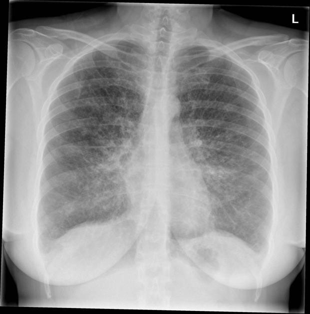 Both hemidiaphragms are effaced, this is likely due to consolidation but it is difficult to rule-out co-existing pleural effusions.