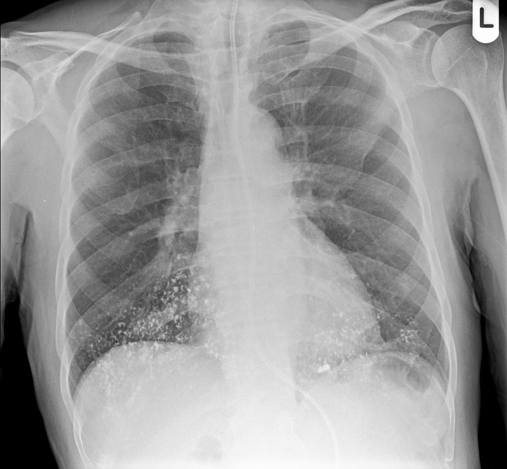 Multiple dense radiopacities demonstrated in both lung bases suggesting aspiration of barium sulphate, I note that a barium swallow was performed yesterday.