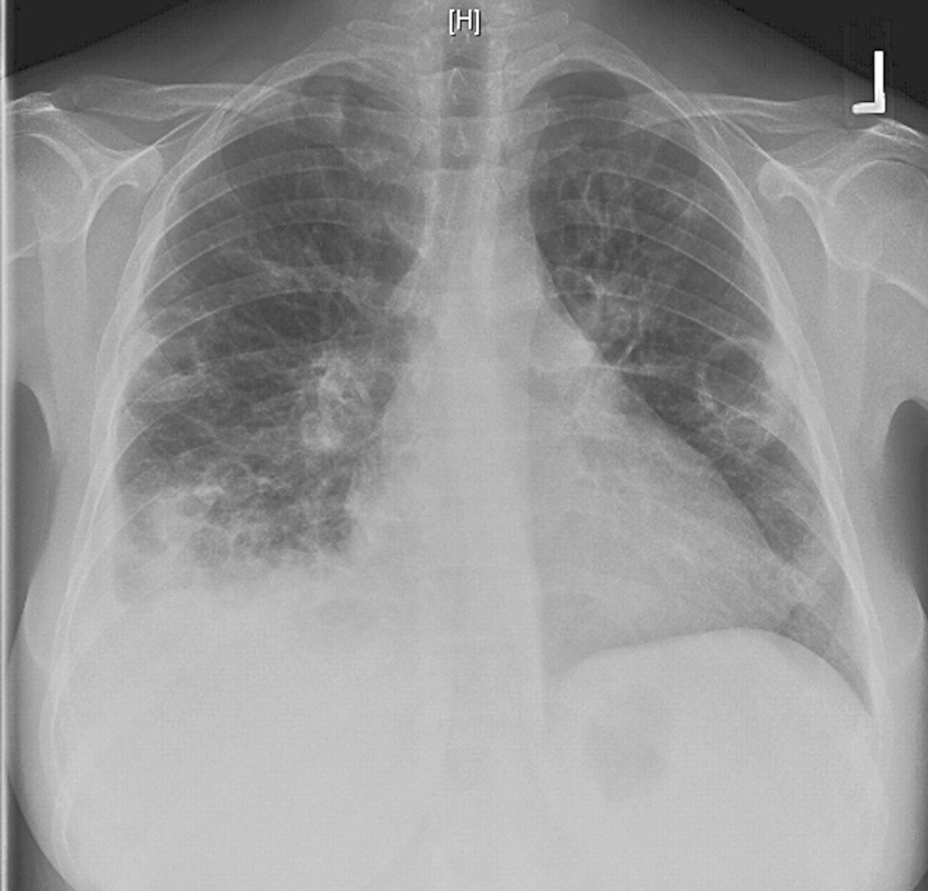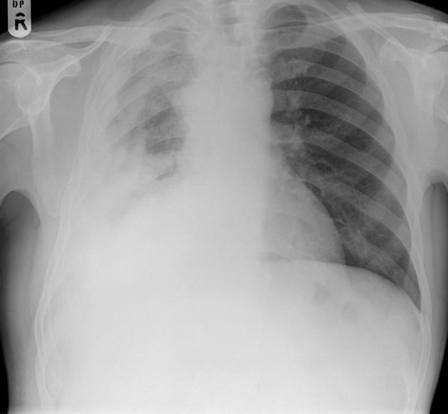 Large well defined mass superimposed over the right hemidiaphragm, with evidence of cavitation.