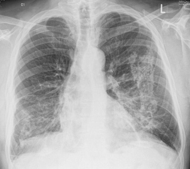 This radiograph demonstrates silicosis. Silicosis can have variable radiographic appearances depending on if it is seen in an acute, classic simple or classic complicated setting. This case is classic complicated silicosis as it also features the mass-like appearances of pulmonary massive fibrosis. PMF represents the coalescence of areas of fibrosis and is a fairly specific complication of pneumoconioses.