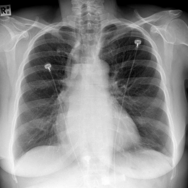 A large teardrop shaped radiopacity is demonstrated over the upper aspect of the right hemithorax. The edge appears calcified. It is unclear if the appearances are iatrogenic or pathological.