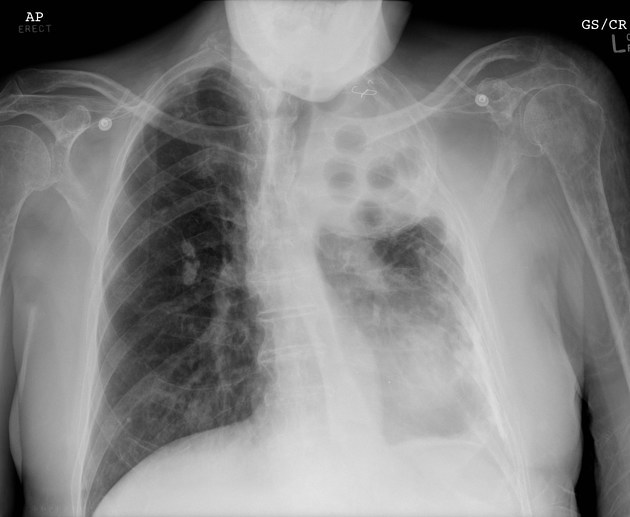 Background left upper zone changes are pathognomonic for plombage, right sided granulomata could suggest previous tuberculous infection.
