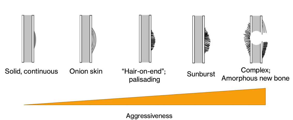 is a sunburst lesion more or less aggressive than an onion skin lesion?