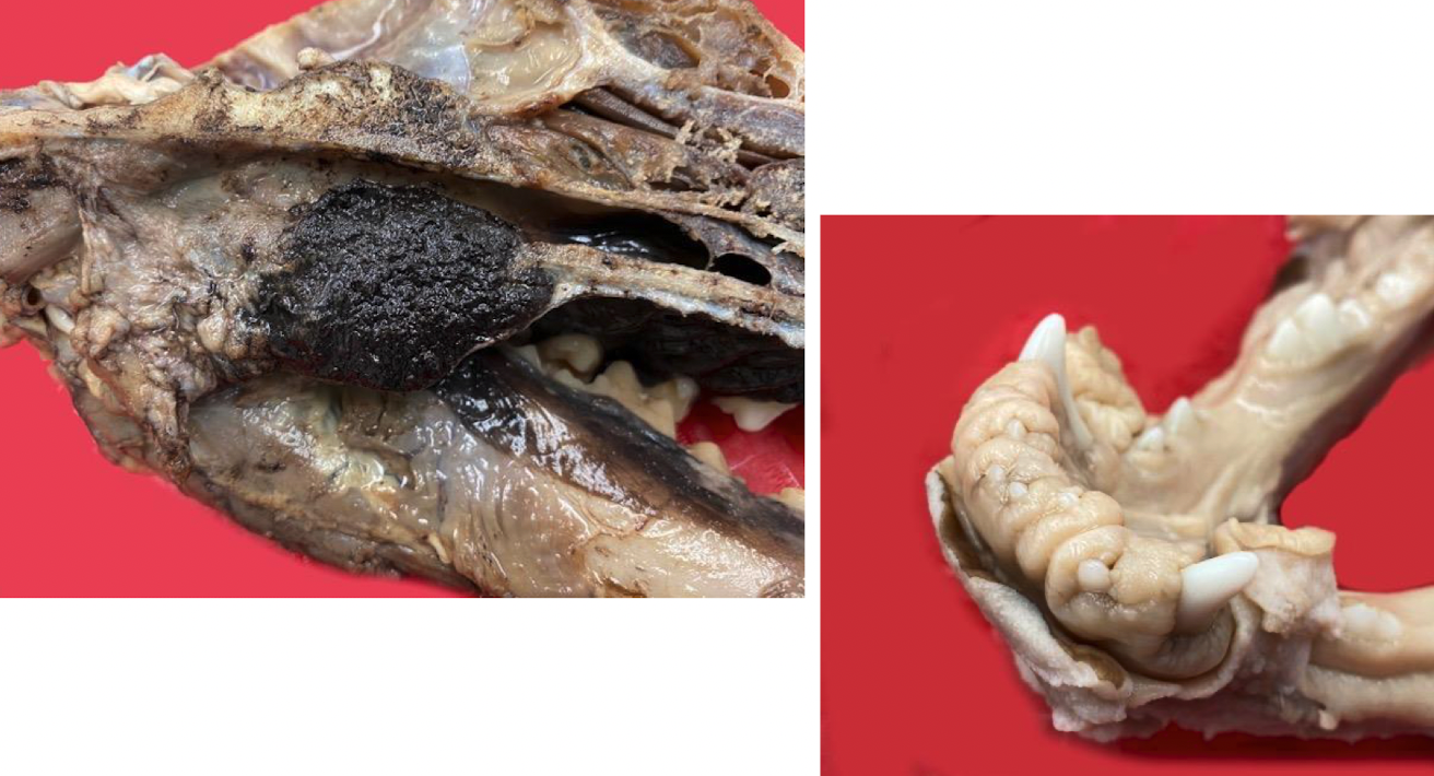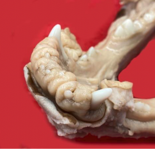 There is marked proliferation of the gingiva surrounding the lower incisors and canine teeth. The proliferating tissue is pale tan and is nearly obscuring the incisors.