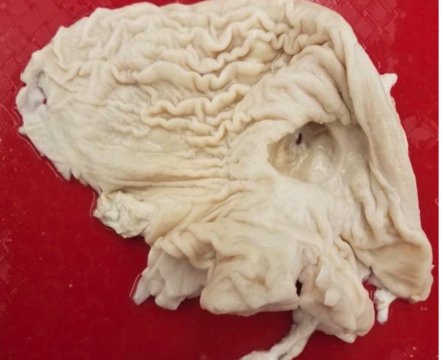 Description: The mucosa is diffusely thickened with a corrugated texture.