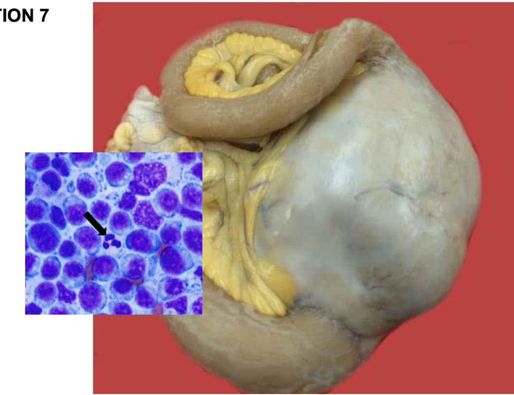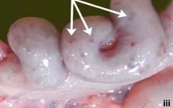 Intestinal adenocarcinoma, like other types of carcinoma, can elicit desmoplasia (production of very firm fibrous connective tissue). This often leads to constriction of the tissue, leading to a “napkin-ring” appearance and possible stenosis/obstruction. If the tumor extends through the serosa, intestinal adenocarcinomas can also seed the abdomen, leading to many smaller nodules throughout the peritoneal cavity (carcinomatosis).