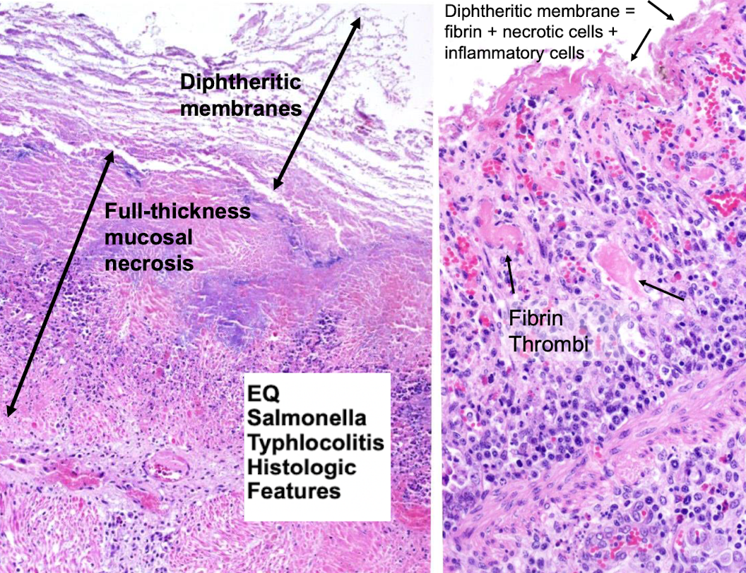 Histologically, there is diffuse mucosal and submucosal infiltration by eosinophils (can also have lymphocytes and plasma cells) with mural smooth muscle hypertrophy. The markedly thickened wall is associated with dysmotility which contributes to the diarrhea. Although this is a primary inflammatory lesion, it can produce secondary segmental obstruction.