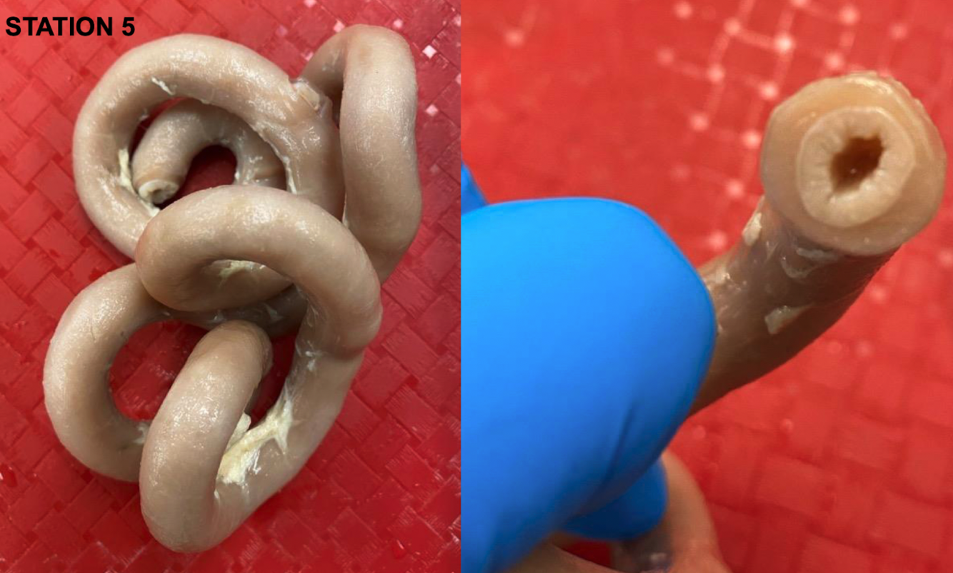 If an ingested string or other linear foreign object becomes immobilized, (e.g., caught at the base of the tongue or pylorus), the intestine will “gather up” or “plicate” along its length. Peristalsis results in progressive mucosal erosion to ulceration as the string (arrow) acts as Gigli wire, leading to perforation and peritonitis.