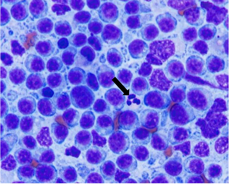 Prior to fixation, the tissue within this mass was soft and bulged on cut section. Cytologic impression smears showed atypical round cells with large round nuclei and scant basophilic cytoplasm. Based on these findings and the gross appearance, what is your morphologic diagnosis?