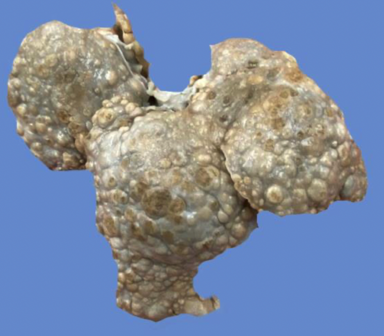 The liver is severely diffusely small with irregular loss of tissue. All lobes consist of multiple round, brown nodules varying in size from 0.3 cm to 1.5 cm in diameter. These round nodules are separated by firm bands of tan fibrosis.