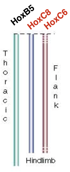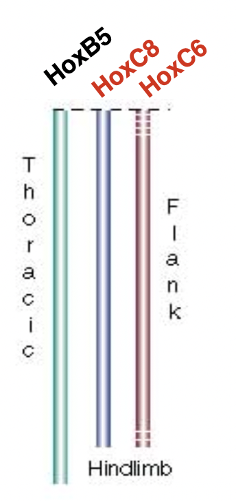 HoxC8 goes from top almost all the way down= hindlimbs very far down, residual nubs