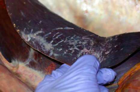 Capsular fibrosis/perihepatitis filamentosa and atrophy of right liver lobe in a horse with colonic impaction.