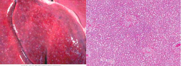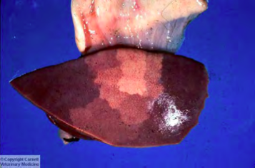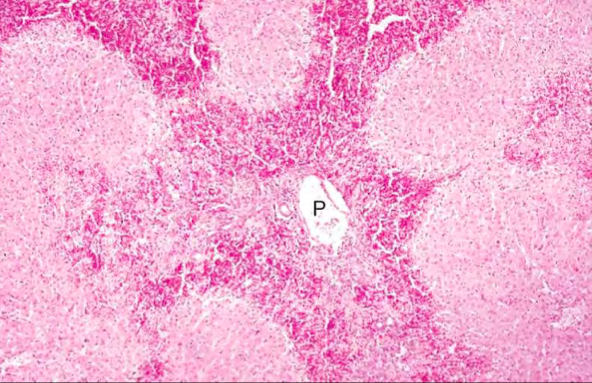 Zone 1, Periportal necrosis. Horse liver P = portal area. Etiology is often toxic