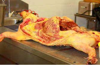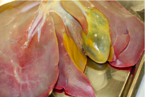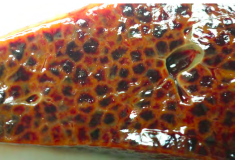 MASSIVE HEPATIC NECROSIS IN HEPATOSIS DIETETICA OF SWINE. CUT SURFACE