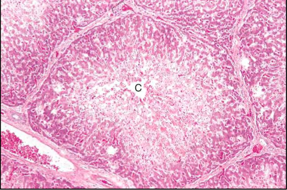 Centrilobular or Zone 3/ periacinar or Centrilobullar necrosis is commonly due to hypoxia. Pig liver. C = central vein
