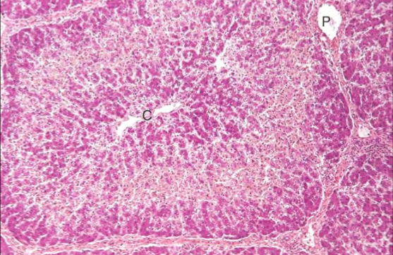 Midzonal necrosis. Pig liver. C = central vein, P = portal area. This pattern of degeneration and necrosis is rarely seen.