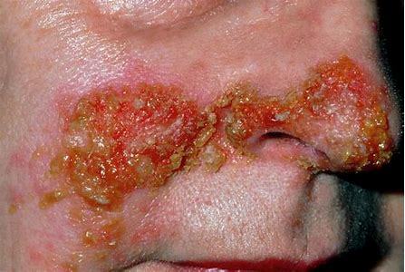 Most common in children highly contagious. reddish sores around the face that turn to a honey-colored crust after a week.