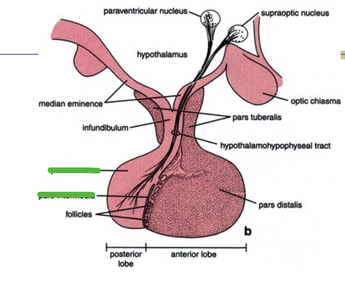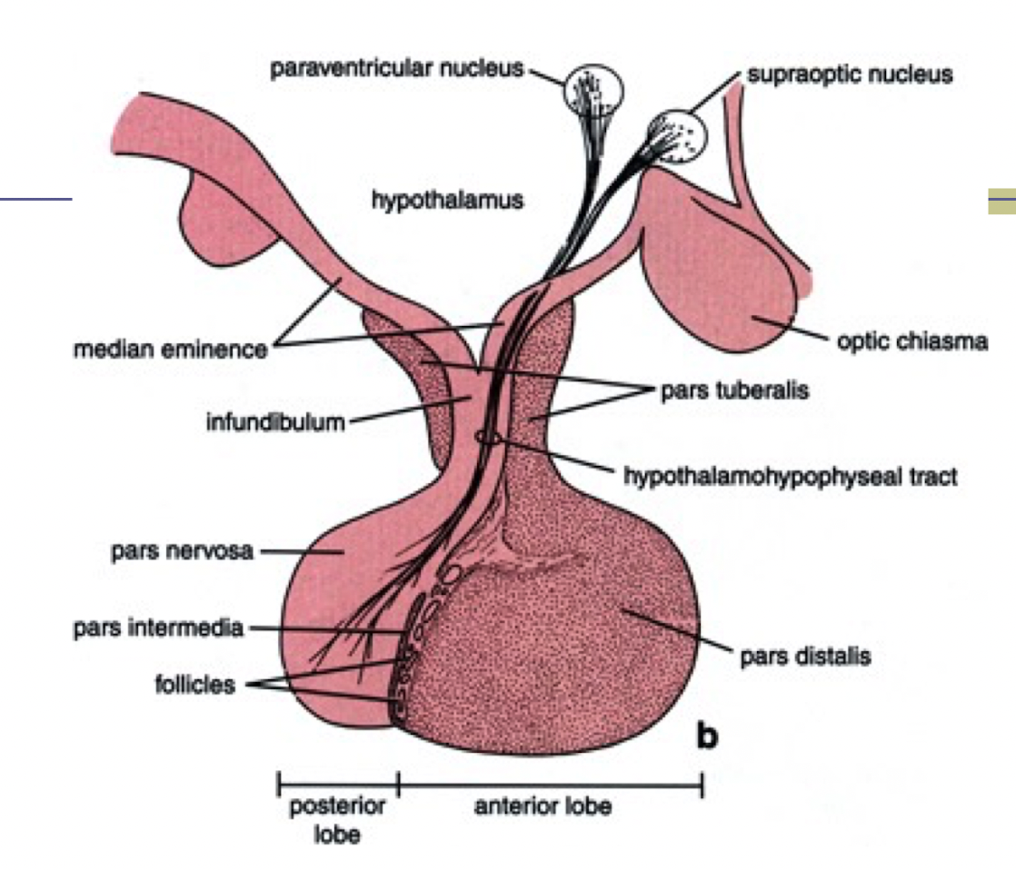 supraoptic and paraventricular nuclei down the pituitary stalk to the posterior lobe (neurohypophysis)