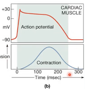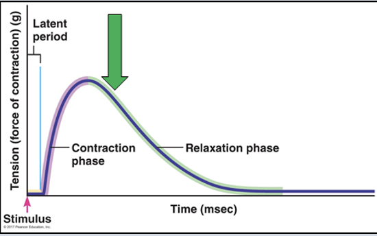 •In reference to the graph below illustrating the contraction of a skeletal muscle fiber over time, what do you think would happen if a second action potential was triggered at the time where the big green arrow is pointing?