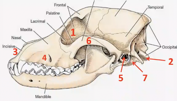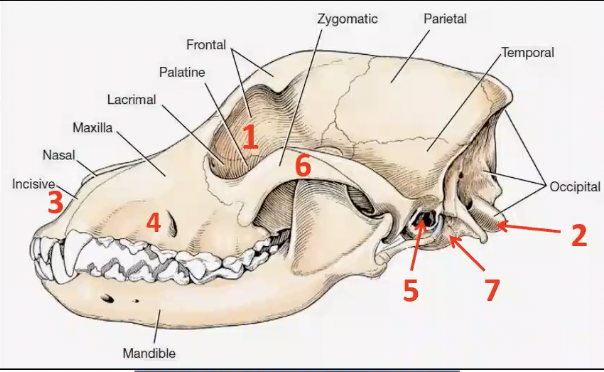 3. External naris •Nostril•Infraorbital canal•A bony canal that runs from orbit to face that transmits infraorbital artery and nerve•Maxillary foramen (entrance)