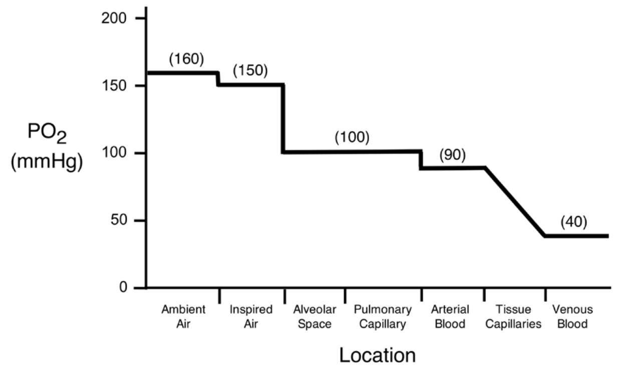 the change in partial pressure of oxygen as is moves from the environment, through the lungs, into the blood, out to the tissues, and back to the heart in the venous circulation