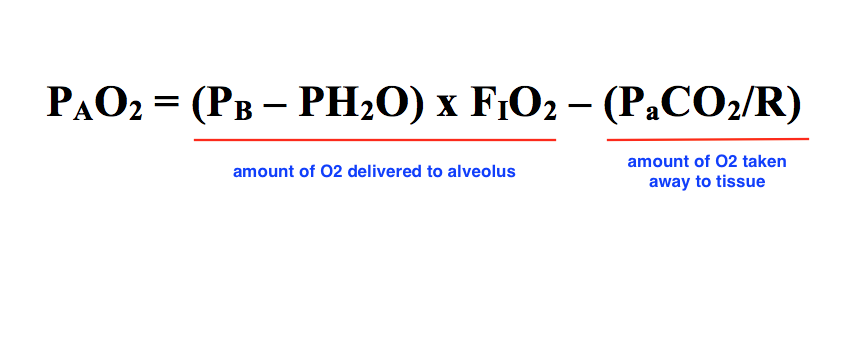 PAO2 = (PB – PH2O) x FIO2 – (PaCO2/R)