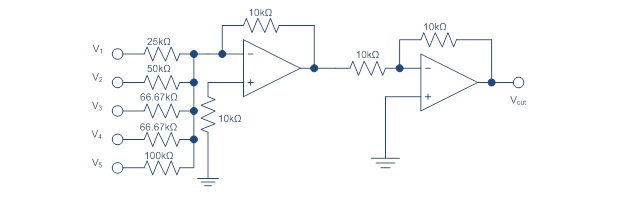a) Vout = (0.400 * V1) + (0.200 * V2) + (0.150 * V3) + (0.150 * V4) + (0.100 * V5)