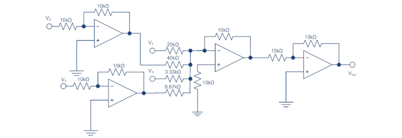 Design an amplifier circuit that performs the following equation. All supplied voltages are positive.