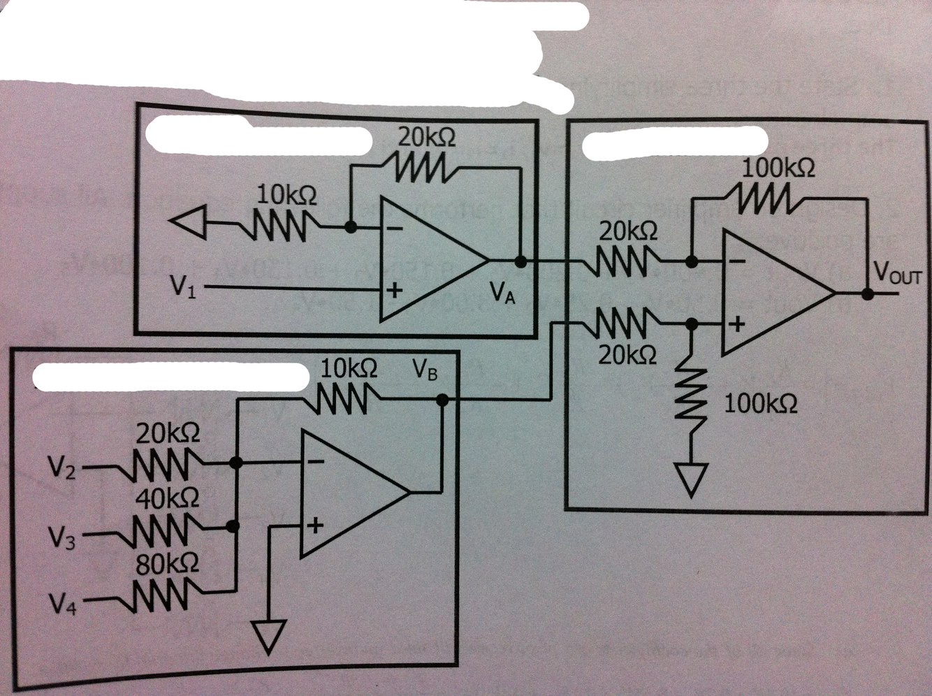 3rd Amplifier summing ratios: V_2→-10kΩ/20kΩ=-0.5; V_3→-10kΩ/40kΩ=-0.25; V_4→-10kΩ/80kΩ=-0.125