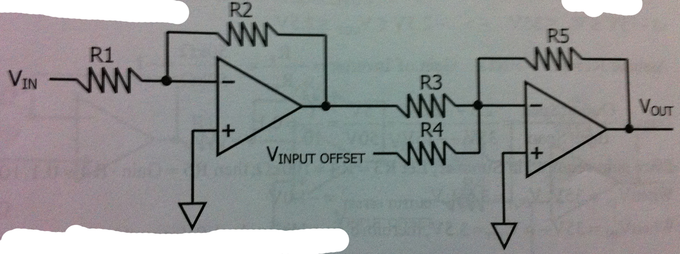2nd Amplifier gain: -5V/((35V- -15V) )=-0.1; if R_f 10kΩ used,then: 10kΩ/0.1=100kΩ