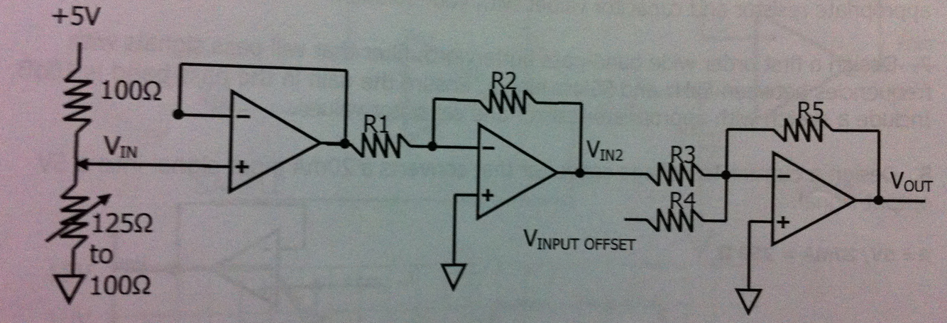 4.a) Using the figure below as a helpful example, design a signal conditioner that will take a -50mV to +50mV output from a thermocouple and convert it into a voltage range of 0 to 5V respectively.