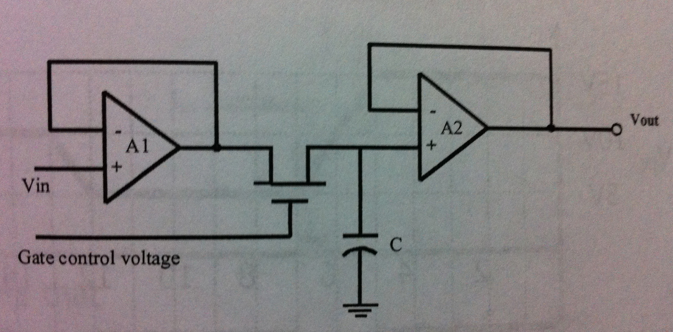The sampling time constant comes from the output impedance of A1 and C. The hold time constant comes from the input impedance of A2 and C.