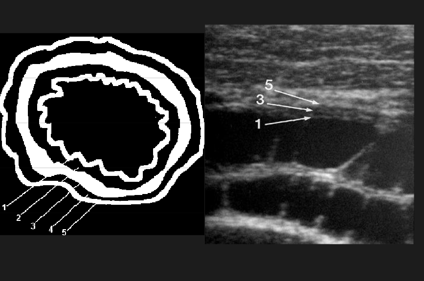 Five layers can be distinguished with transabdominal sonography