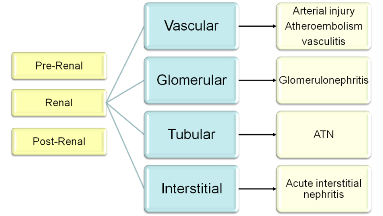 What are the 3 categories of renal failure? Once has 4 sub-categories, what are they?