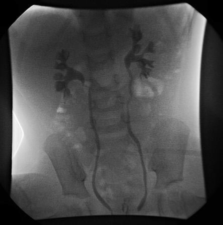 Is this fluoroscopic voiding cystourethrogram (VCUG) image of a 2 year old boy normal?