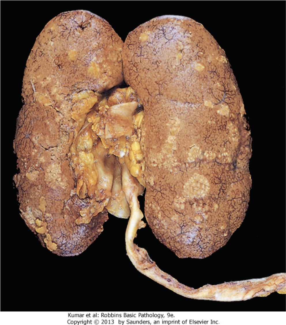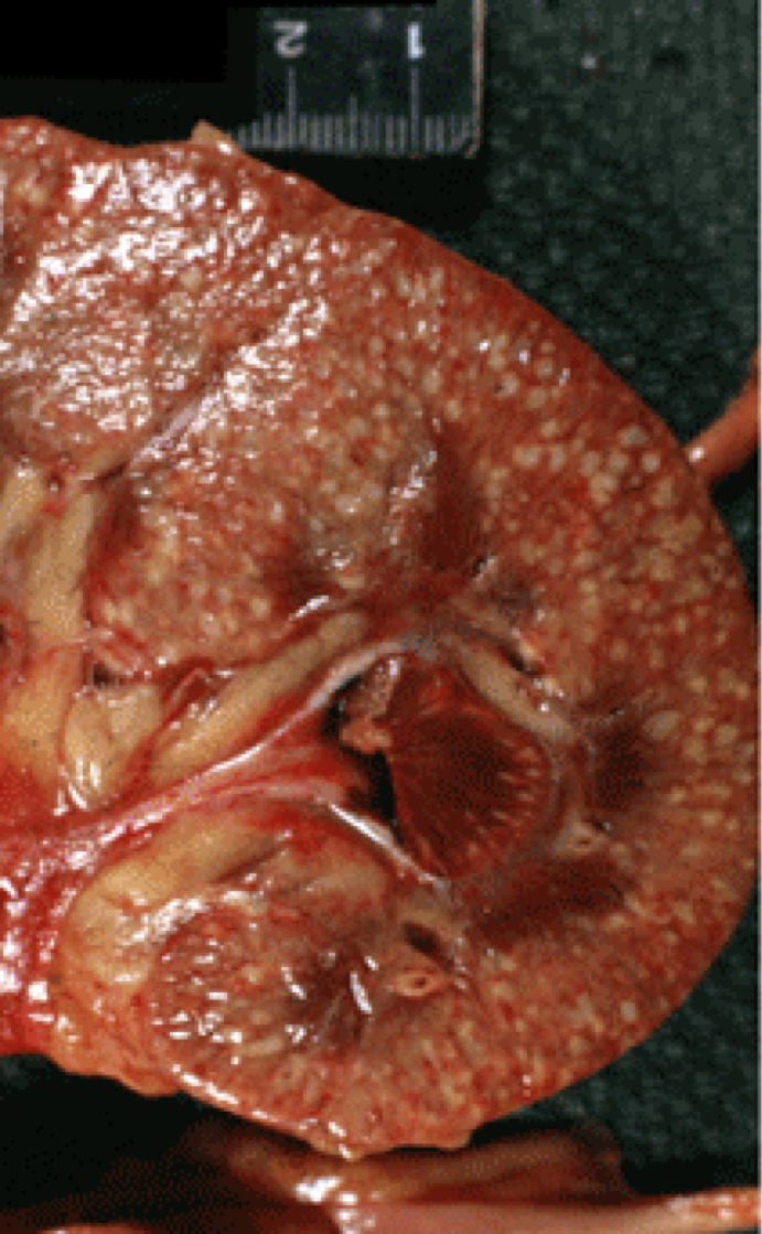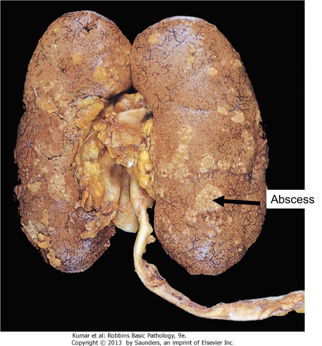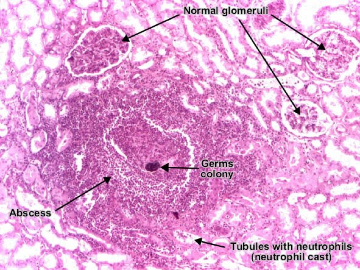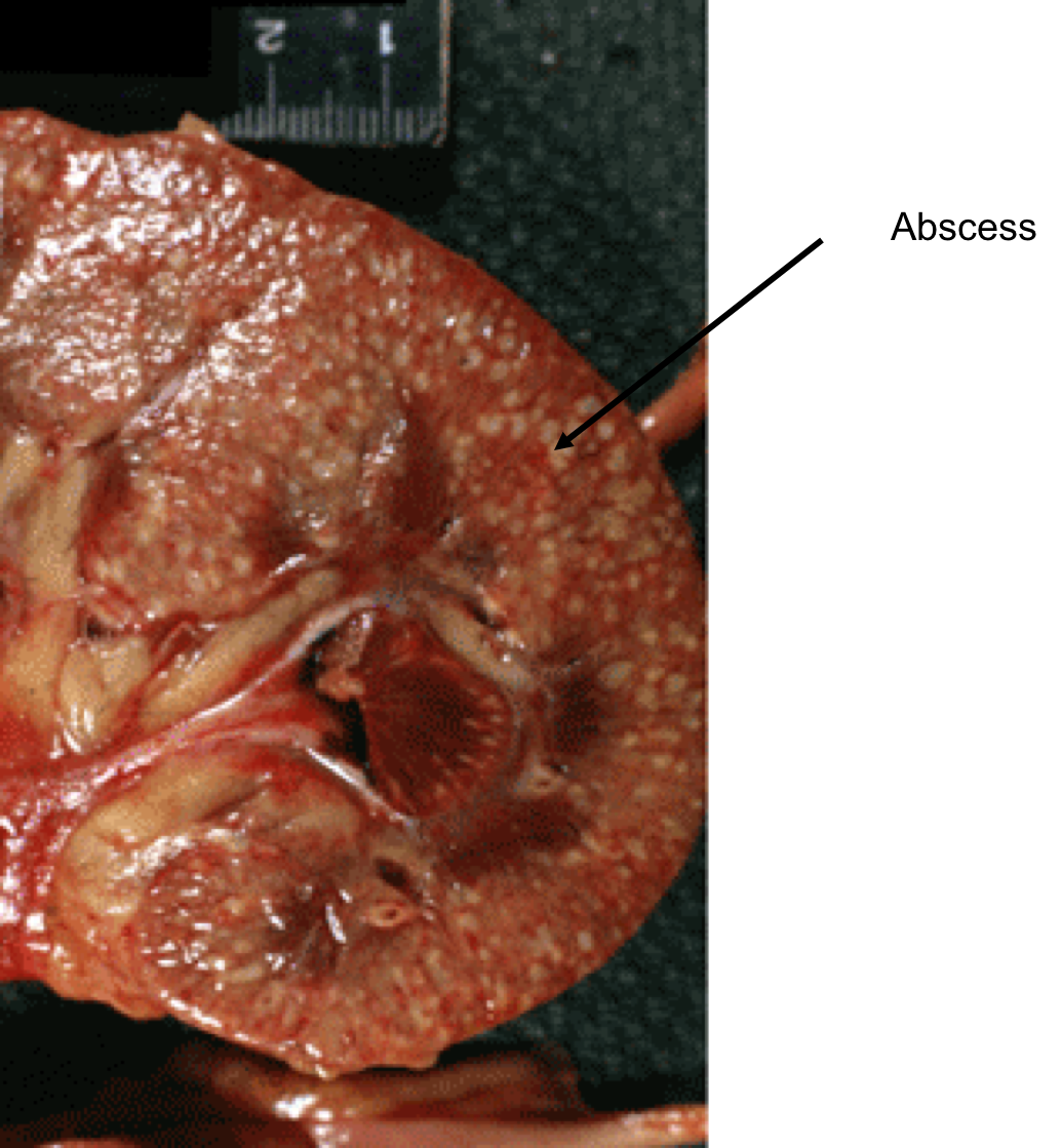 The inside of a kidney demonstrating acute pyelonephritis