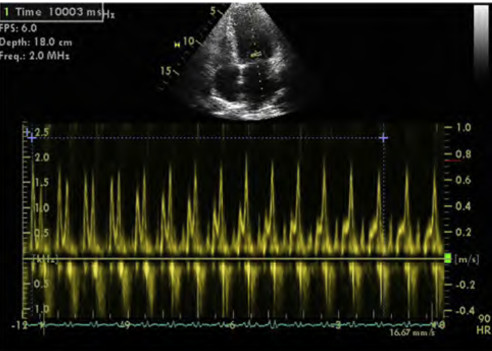 ***Continuous recording of mitral inflow during standardized Valsalva maneuever for 10s –> decrease in E/A ratio with straining, which is consistent with elevated LV filling pressures