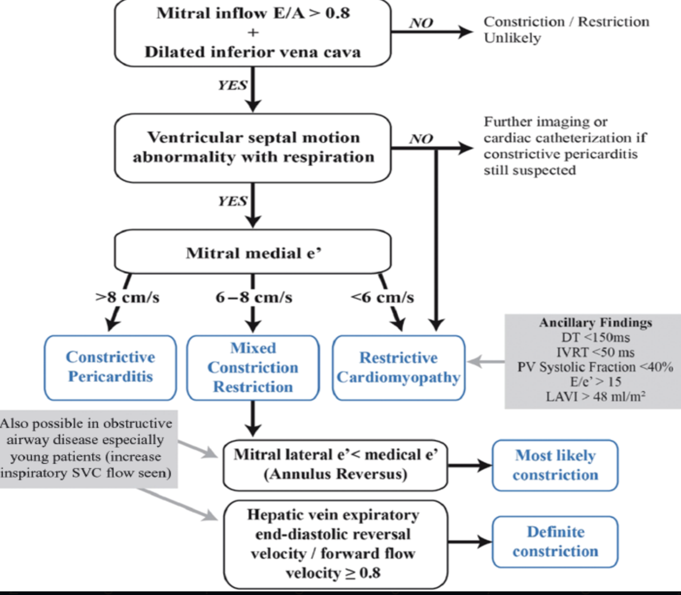 Describe the algorithm differentiating CP and Restrictive Cardiomyopathy?