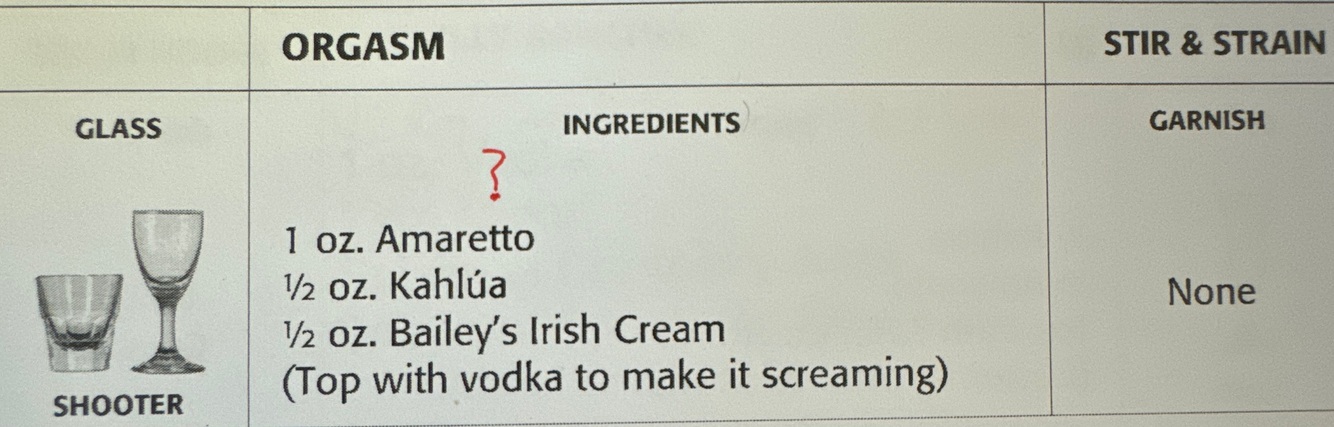 Example sentence: “Mix 1/3 Kahlúa, 1/3 Bailey’s Irish Cream, and 1/3 Grand Marnier to make a B-52 cocktail.”