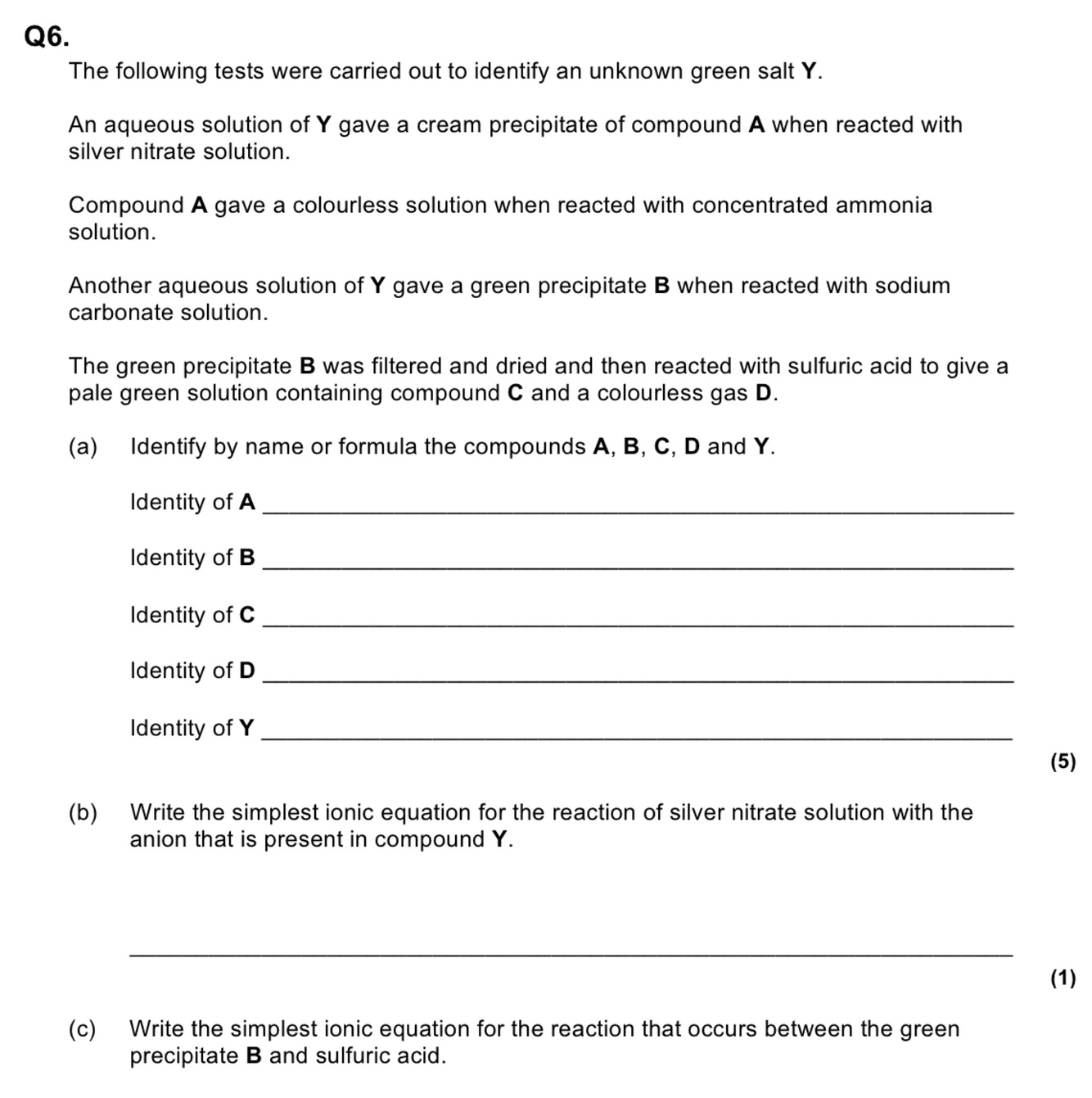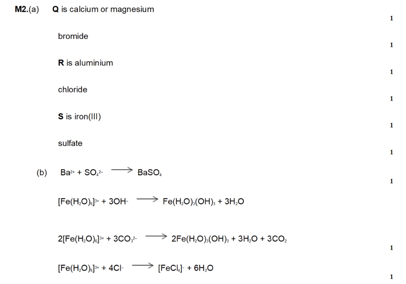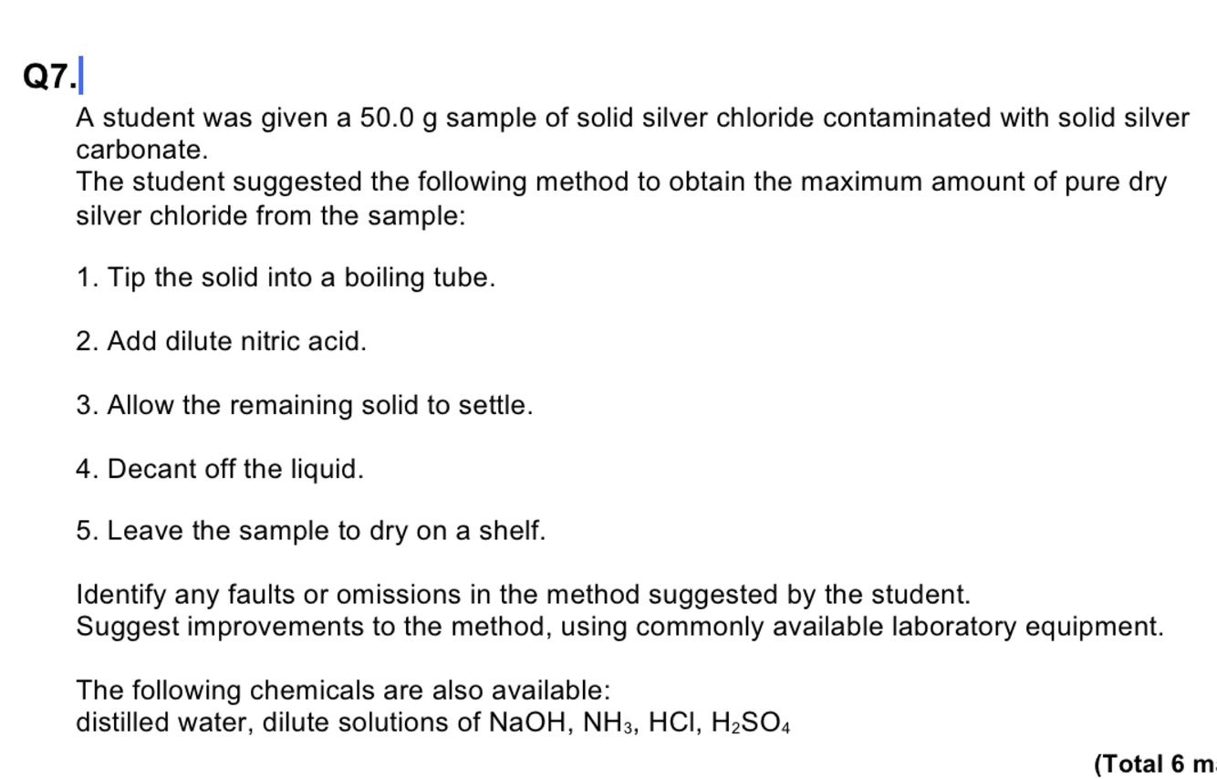 Q5.In an experiment to determine its solubility in water, solid barium hydroxide was added to 100cm of water until there was an excess of the solid. The mixture was filtered and an excess of sulfuric acid was added to the filtrate. The barium sulfate produced was obtained from the reaction mixture, washed with cold water and dried. The mass of barium sulfate was then recorded.