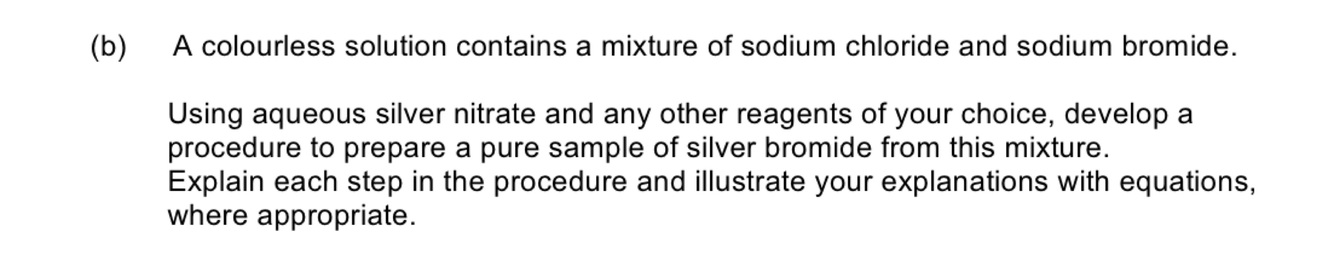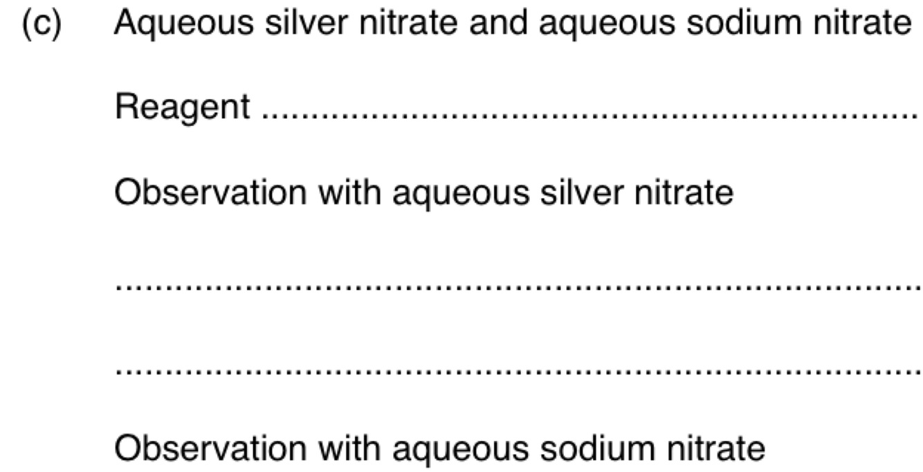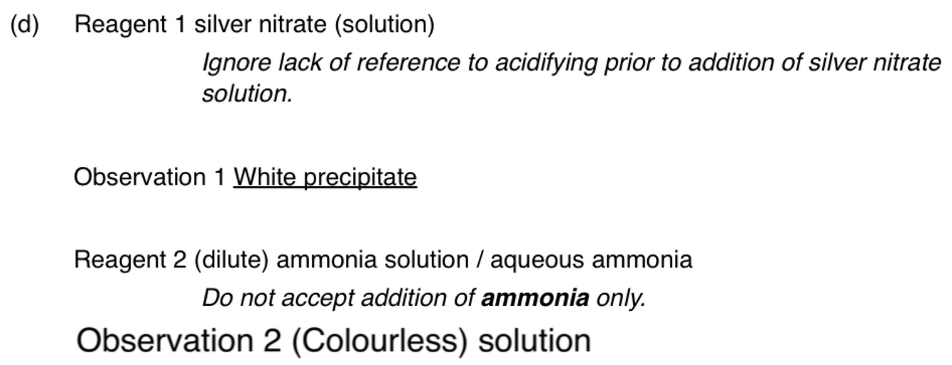 Identify the two reagents that could be used in a test to confirm that the solutions contained chloride ions, not bromide ions. State what would be observed on addition of each reagent.